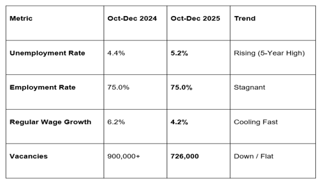 Flat Vacancies: The number of open roles remained broadly flat at 726,000. While not collapsing, the lack of growth suggests that businesses are opting for "natural attrition" and automation rather than active recruitment.